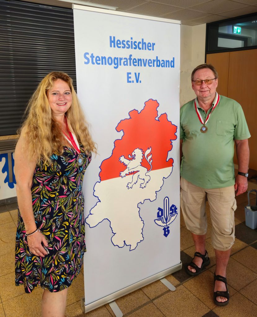 Die Mitglieder der Langener Delegation bei den Hessischen Mannschaftsmeisterschaften in Bad Vilbel nach der Siegerehrung: Regine Daneke, Uwe Daneke. Es fehlen Dr. Jascha-Alexander Koch und Mathias Keller (Bild: Stenografenverein)