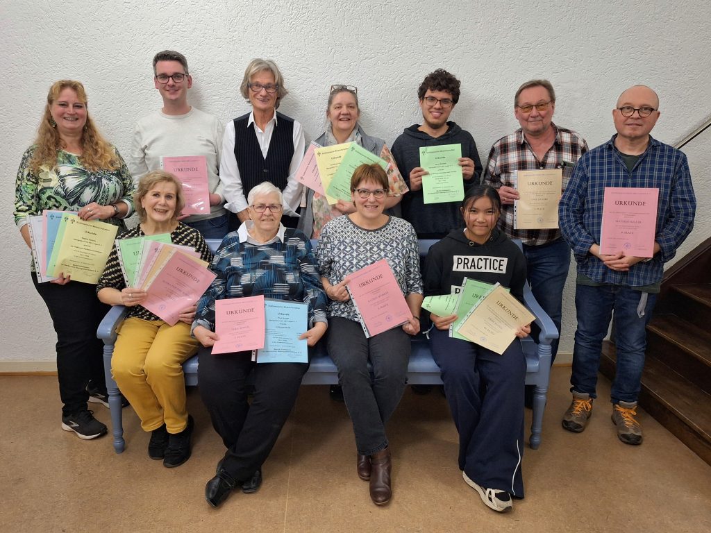 Nach der Siegerehrung des Vereins- und Bezirkswettschreibens: Die erfolgreichen Teilnehmenden mit Bezirksvorsitzendem Michael Raub (hinten 3. von links): Regine Daneke, Dr. Jascha-Alexander Koch, Christine Fels-Berg, David Schwab, Uwe Daneke, Mathias Keller (hinten v. l. n. r.), Elvira Pascher-Kneißl, Thea Boegel, Katrin Schmitz, Heidi Ruths (vorne v. l. n. r., Foto: Detlef Möbius)